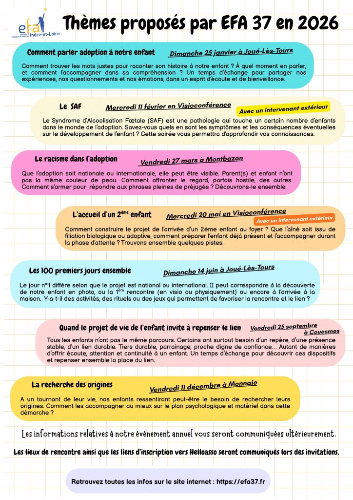 EFA 37 vous présente son agenda 2026, dédié aux événements et réunions autour de l’adoption en Indre-et-Loire.
