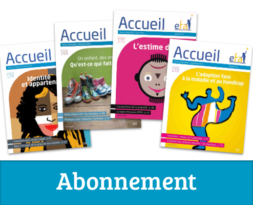 « Accueil » est une revue trimestrielle réalisée par EFA. C’est la seule revue française consacrée à l’adoption. « Accueil » propose des témoignages d’adoptés et d’adoptants, des textes émanant de travailleurs sociaux, psychologues, psychanalystes, sociologues, juristes, écrivains.